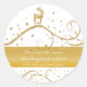 Elegant Christmas (Xmas) greeting stickers with customisable templates are ideal this festive season. DESIGN: A stylish gold design of beautiful, swirling lines, which have snowflakes falling around them and a single reindeer, with forward curling horns standing side on to the viewer. There is a horizontal gold band near the bottom edge with is bordered by the snow and classy swirls. CUSTOMIZE IT: Change the wording; the background colour; the style / size and colour of the font and feel free to re-size and move things around to ensure that it meets your personal and company requirements this silly season. USE IT FOR: Reminders to clients; suppliers; family and friends that your company / factory will be closing for the festive period. MATCHING RANGE: Visit our homepage to view the full range of merchandise in this design. CUSTOM ORDERS: For any special requests; colour changes or designs you require, visit our homepage. COPYRIGHT: © Robin Wood - all rights reserved. STORE ADDRESS: http://www.zazzle.com/mensgifts*