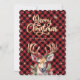Red calligraphy Christmas card featuring a watercolor painting of a deer, holly, red berries and other winter botanicals on a red buffalo plaid background adorned by snowflakes.