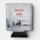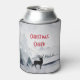 Can cooler with a watercolor image featuring a black silhouette reindeer standing among some pine trees. Grey black and white neutral colour scheme.