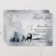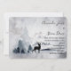 A wedding invitation with a watercolor image featuring a black silhouette reindeer standing among some pine trees. Grey black and white neutral colour scheme.