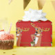 Paper decorated with cartoon of reindeer playing a saxophone.