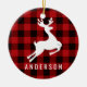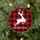 Square holiday ornament features a monogram of your last name (or other text) with a red and black check plaid buffalo patterned frame and white reindeer silhouette.