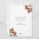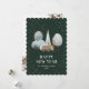 Cute green New Year card featuring a watercolor painting of a doe and a buck wearing a scarf in a snowy forest against a green background adorned with falling snow on the front and a watercolor painting of white poinsettia, conifer tree branches, holly and red berries at the back.