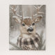 A reindeer in a snowy forest wears a plaid winter scarf, among pine cones and forest. A serene winter scene puzzle keepsake to enjoy with family or friends during the winter and holiday season. A perfect gift for an avid puzzler or for the kids to enjoy during the holiday fun.