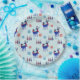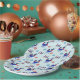 Paper plats with a repeating pattern. Illustrated with a pair of blue scandinavian deer wearing red scarves. With decorative markings on their bodies. As well as a trio of red and blue christmas trees with a star on top. Fancy snowflakes sprinkled around.
