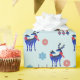 Wrapping paper with a repeating pattern. Illustrated with a pair of blue scandinavian deer wearing red scarves. With decorative markings on their bodies. As well as a trio of red and blue christmas trees with a star on top. Fancy snowflakes sprinkled around.