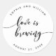 Wedding sticker featuring the words "Love is Brewing" in a relax cursive script in black against a white background.