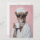 A stylish leopard enjoys a cosy morning, wrapped in a white robe with a towel on its head, sipping coffee while wearing sunglasses against a chic pink background.