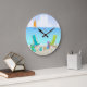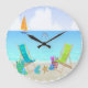 This Relaxing Beach Wall Clock features a beach background with ocean, sand, sailboat and dolphin, two colourful beach chairs with beach bags, beach hats, flip flops starfish. Perfect for any room in your home, beach house or office. Also makes a wonderful housewarming gift! Matching items include; pillows, dinner & cocktail napkins, place mats, kitchen towels, tiles/trivets, coaster set, mugs, pitcher, teapot and candy jars are also available in our shop.