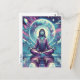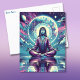 Meditation postcard. A beautiful serene relaxing ai illustration of a blue and purple scene with a woman medicating in front of the moon, planets, stars and galaxy to give you a peaceful vibe. Pretty for a meditation room or a yoga studio.