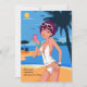 A beach-scene invitation featuring a woman in a bathing suit holding a drink. Palms trees, sunshine and sand create the background. Ideal for a bachelorette party or beach party. Design by Vecteezy.
