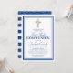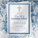 Boy's first holy communion invitation featuring a simple white background that can be changed to any colour, a navy blue double border, a religious silver cross with white flowers, and a holy communion template that is easy to personalise. The back features blue and white nautical stripes, and silver glitter.