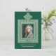 This traditional Irish Catholic memorial design features a Celtic cross and knotwork frame in white set against a deep green backdrop, symbolising eternal life and the Christian heritage of the faithful departed. The Chi-Rho monogram affirms the hope of the Resurrection through Christ. Ideal for wakes, funeral Masses, and remembrance keepsakes, this layout beautifully honours the life of a beloved daughter of the Church with solemnity and grace.