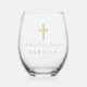 Custom Text Religious Cross Dusty Blue Script Boy Baptism Stemless Wine Glass.