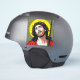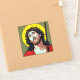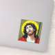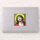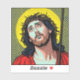 Classic religious portraiture meets vintage comic book aesthetics in this striking graphic interpretation. The design features a central figure with a crown of thorns and a radiant yellow halo, rendered with bold black outlines and a vibrant primary colour palette of red, blue, and yellow. Distinctive Ben-Day dots provide texture and depth to the skin tones and background, capturing a retro halftone print effect. A heavy black border frames the composition, completing the pop art panel appearance.