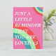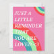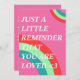 This Valentine’s Day card features a colourful design with the message: "JUST A LITTLE REMINDER THAT YOU ARE LOVED <3." Perfect for expressing your love and appreciation to friends, family, or a special someone. The vibrant and cheerful design adds a heartfelt touch to your sentiments, making it a lovely keepsake for those you care about.
