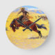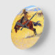 Clock featuring Frederic Remington’s oil painting Cold Morning on the Range (1904). A cowboy rides a brown and rambunctious horse. A great gift for horse lovers and the Old West.