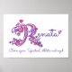 Pretty R monogram art name poster perfect for a girls bedroom or playroom in shades of pink and purple. Personalise with your name beginning with R, and name meaning for a truly personalised touch to your child's bedroom or nursery, this example is for the name Renata Born again. Spiritual, athletic and regal. Cute poster print ideal for a new baby, christening or baby shower gift. © Unique lettering R monogram hearts and flowers drawing and graphic art design by Sarah Trett. www.sarahtrett.com for www.mylittleeden.com