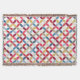 A repeat circular quarters cut out style patterned throw in warm tonal colours of red, browns, grey and blue on a white background by Sarah Trett. Would look great in a bedroom, lounge room.