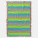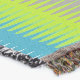 A repeat three colour bright dogtooth stripe patterned throw in lime green, blue and grey by Sarah Trett. Would look great in a bedroom, lounge room.