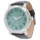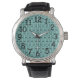 This men's watch has a mid-century modern design of squares with a line and a line of circles, all black, repeating across the design on a field of seafoam. If you like the design but prefer different colours, message me.