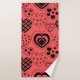 This towel set has a black washcloth, a red hand towel and a bath towel with a Valentine’s design of repeating hearts with different graphics inside on a field of red.