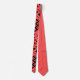 This tie has a Valentine's design of repeating hearts with different graphics inside on a field of red.