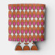 This can cooler has a mid-century modern design of repeating orange ovals with pink ovals inside.