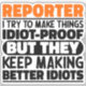 Funny Reporter Sayings "Reporter I Try To Make Things Idiot Proof But They Keep Making Better Idiots". Grab this Funny Reporter design as a funny gifts for an awesome mum, dad or friend.