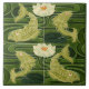 Reproduction from a tile made in Germany around 1900-1905. Jugendstil style is a type of art nouveau that foreshadowed the art deco movement. Rich, colorful and vibrant for a bold design of fishes in a pond with waterlilies, all in olive green and sage green.