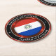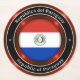 The national flag of the Republic of Paraguay (Official Name), is infused into a circle shape. There is a black inner ring, on which the official country name is written in Spanish and in English. The design is colored in a red/orange mixture to give it an almost bronze-like look.