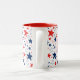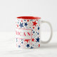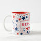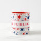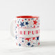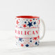 This ceramic coffee mug is shown with a patriotic stars print and republican text.