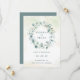 Elegant Spanish Save The Date card featuring "Reserva La Fecha" inside of a wreath comprised of eucalyptus leaves and greenery with a hint of blue. Below are your wedding details in dark green over a pastel watercolor wash with speckles of faux gold glitter. The backside is a matching shade of soft blue green. This simple, rustic design is great for a botanical themed wedding in the summer.