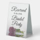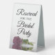 This simple tabletop sign will let your wedding guests know which areas are reserved for the bridal party. The classic timeless design features elegant script lettering and a single long-stemmed dusty rose or mauve pink coloured rose lying on its side mirrored in a pool of water.