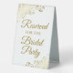 This simple tabletop sign will let your wedding guests know which areas are reserved for the bridal party. The simple gold and white design features elegant script lettering with decorative curls and swirls in the corners.