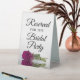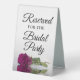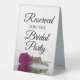 This simple tabletop sign will let your wedding guests know which areas are reserved for the bridal party. The classic timeless design features elegant script lettering and a single long-stemmed magenta, raspberry, or cassis purple coloured rose lying on its side mirrored in a pool of water.
