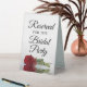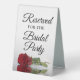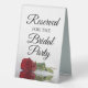 This simple tabletop sign will let your wedding guests know which areas are reserved for the bridal party. The classic timeless design features elegant script lettering and a single long stemmed red rose lying on it's side mirrored in a pool of water.