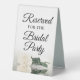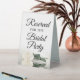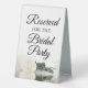 This simple tabletop sign will let your wedding guests know which areas are reserved for the bridal party. The classic timeless design features elegant script lettering and a single long stemmed ivory, white, or cream coloured rose lying on its side mirrored in a pool of water.