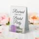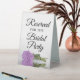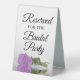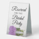 This simple tabletop sign will let your wedding guests know which areas are reserved for the bridal party. The classic timeless design features elegant script lettering and a single long-stemmed lilac purple coloured rose lying on its side mirrored in a pool of water.