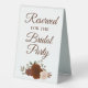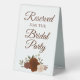 This simple tabletop sign will let your wedding guests know which areas are reserved for the bridal party. The beautiful boho chic design features elegant script lettering and a cluster of hand painted watercolor roses in autumn shades of rust orange, peach, and burnt umber, along with sprigs of eucalyptus leaves and garden greenery.