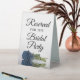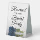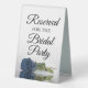 This simple tabletop sign will let your wedding guests know which areas are reserved for the bridal party. The classic timeless design features elegant script lettering and a single long-stemmed dusty steel blue or blue-grey coloured rose lying on its side mirrored in a pool of water.