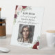 This beautiful wedding sign is a wonderful way to remember and recognise a loved one who has passed away and is watching the ceremony from heaven. The sign features a photo of your loved one with the wording Reserved in loving memory of with their name and relationship to the couple. The artwork includes hand painted watercolor roses in shades of burgundy, red, and blush pink along with sprigs of eucalyptus leaves and garden greenery.