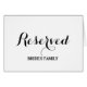 Reserved table or seating sign card for place. Elegant script calligraphy typography for fancy wedding party, chic bridal shower, engagement or anniversary. Classy placement note cards with name of bride and groom family, VIP guests, bridesmaids, groomsmen, best man, maid of honour etc.