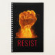 Social justice themed planner features large fist of fire and flames with customisable "RESIST" text in red modern font on black background.