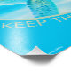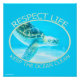 A digital painting of a sea turtle swimming in blue water, heading down to the soft sand. The artwork is in an oval shape that has a green border. At the top in green is, "Respect Life". Below the art in green is, "Keep the Ocean Clean". Image Copyright ©2024 Kimberly J Tilley.