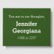 This minimal funeral/memorial sympathy guestbook features the message "You are in our thoughts,", and the custom name and birth/death dates of the individual who has passed on. It has white text on a dark green background. It could be used to record sympathetic wishes for the relatives and friends of somebody who has recently passed on.