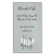 A custom restaurant magnetic business card template with script text and a set of utensils on a pretty embroidered napkin in black, white and grey. Customise it to change fonts, add your own logo and more, even save your design for later.