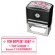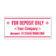 This respectable rubber stamp design features the message "FOR DEPOSIT ONLY", in addition to a personalised name and account number. It could perhaps be used by an office clerk or a small business owner to efficiently add a restrictive indorsement to a check.