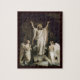 Jesus with arms outstretched as he walks out of the tomb. Angels with hands clasped in worship. Artwork by Carl Bloch