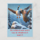 The image depicts a woman who has recently retired and she is happy because she has a lot of free time, She's jumping up as she's trying to fly together with a big goose. The surrounding atmosphere, even though is cold in the winter time, is not an obstacle to celebrate her joy. This postcard is customisable and you can change the texts as you wish.